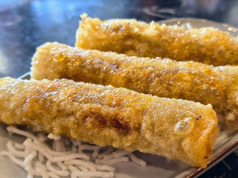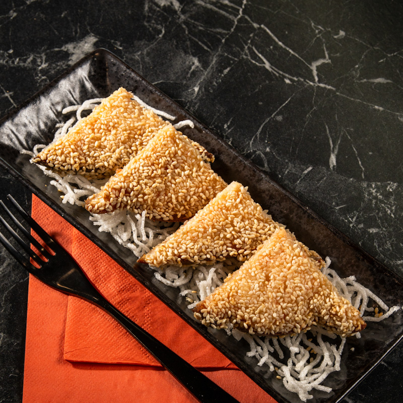 Hand make dim sim. Golden, crispy dim sim with a savory filling. 4pcs. GF. Contain: Sesame, Egg, Sulphites.
