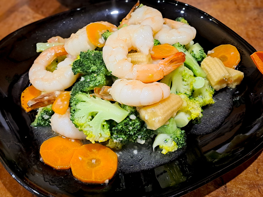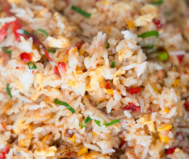 A delicious mix of BBQ pork and juicy prawns stir-fried with rice, eggs, and vegetables for a flavorful dish. GF. Contain: Egg, Soy, Crustacea.