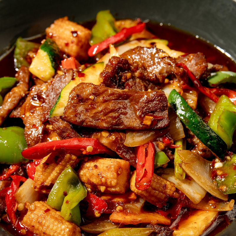 Spice Level Hot. Spicy and aromatic beef stir-fried with Sichuan peppercorns and chili, delivering a numbing heat. GF. Contain: Soy.