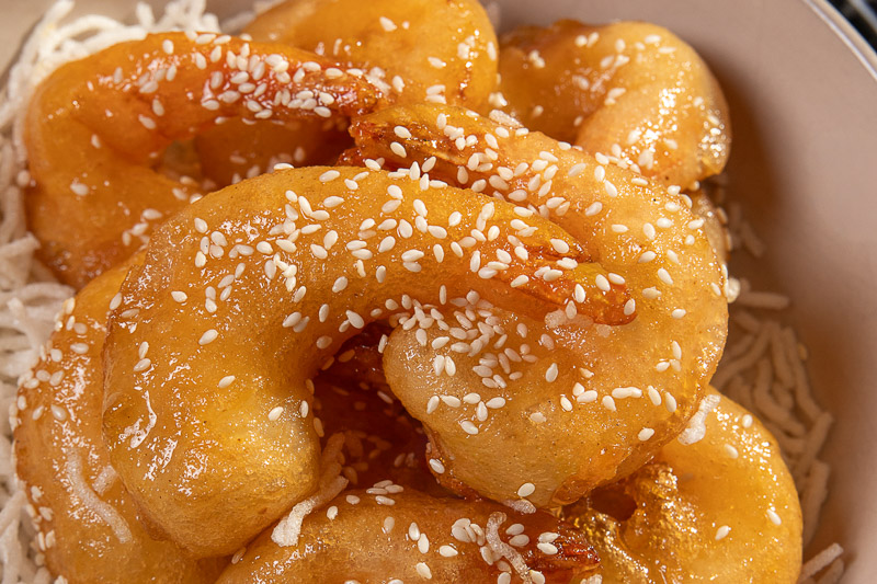 Gluten Free. Tender prawns glazed in a sweet honey sauce. Contain: Crustacea.
