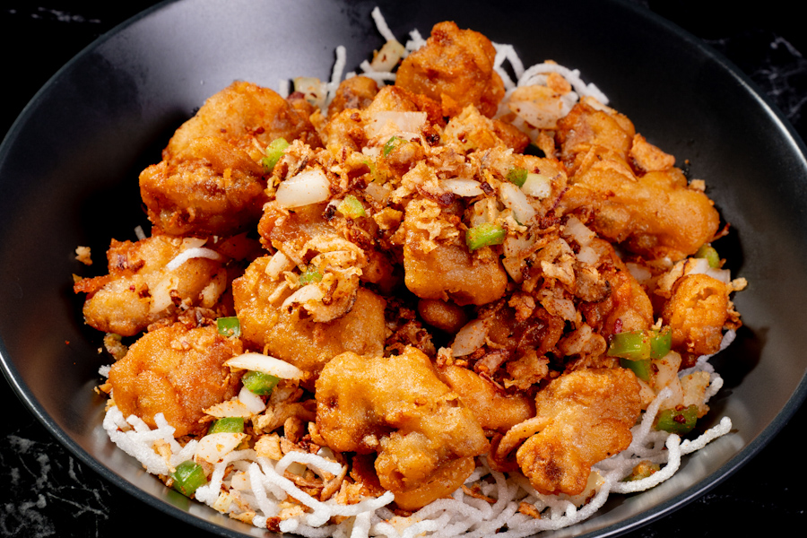 Spice Level Medium. Golden-fried pork with a spicy kick, stir-fried with fresh chilies and garlic. GF.