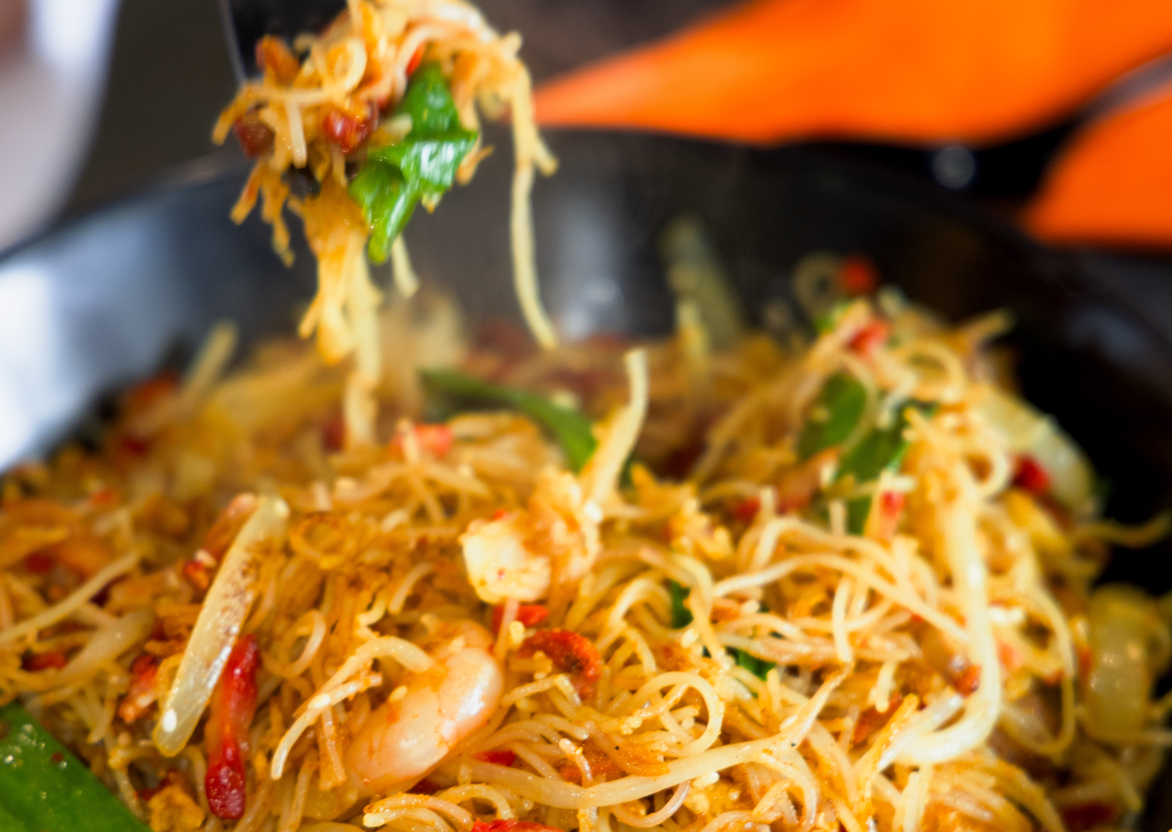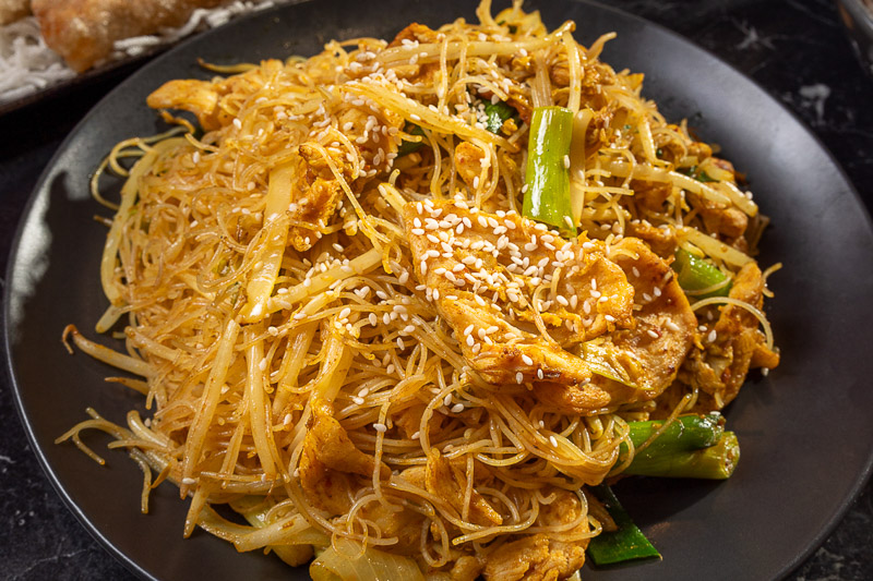 Spice Level Mild. Fragrant rice vermicelli stir-fried with BBQ pork, prawns, and vegetables in a mildly spicy curry blend. GF. Contain: Egg, Soy, Crustacea, Sesame (from garnish).
