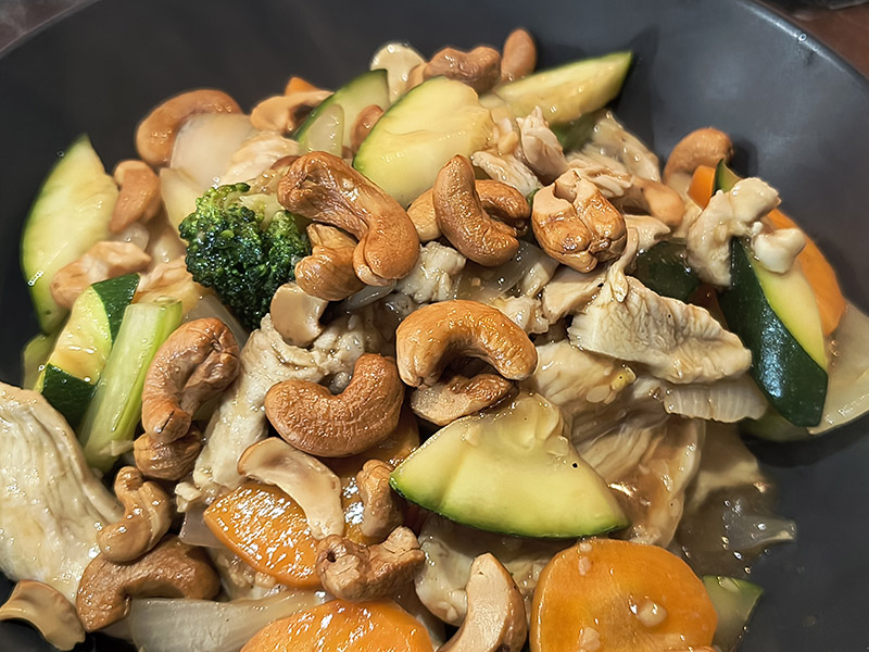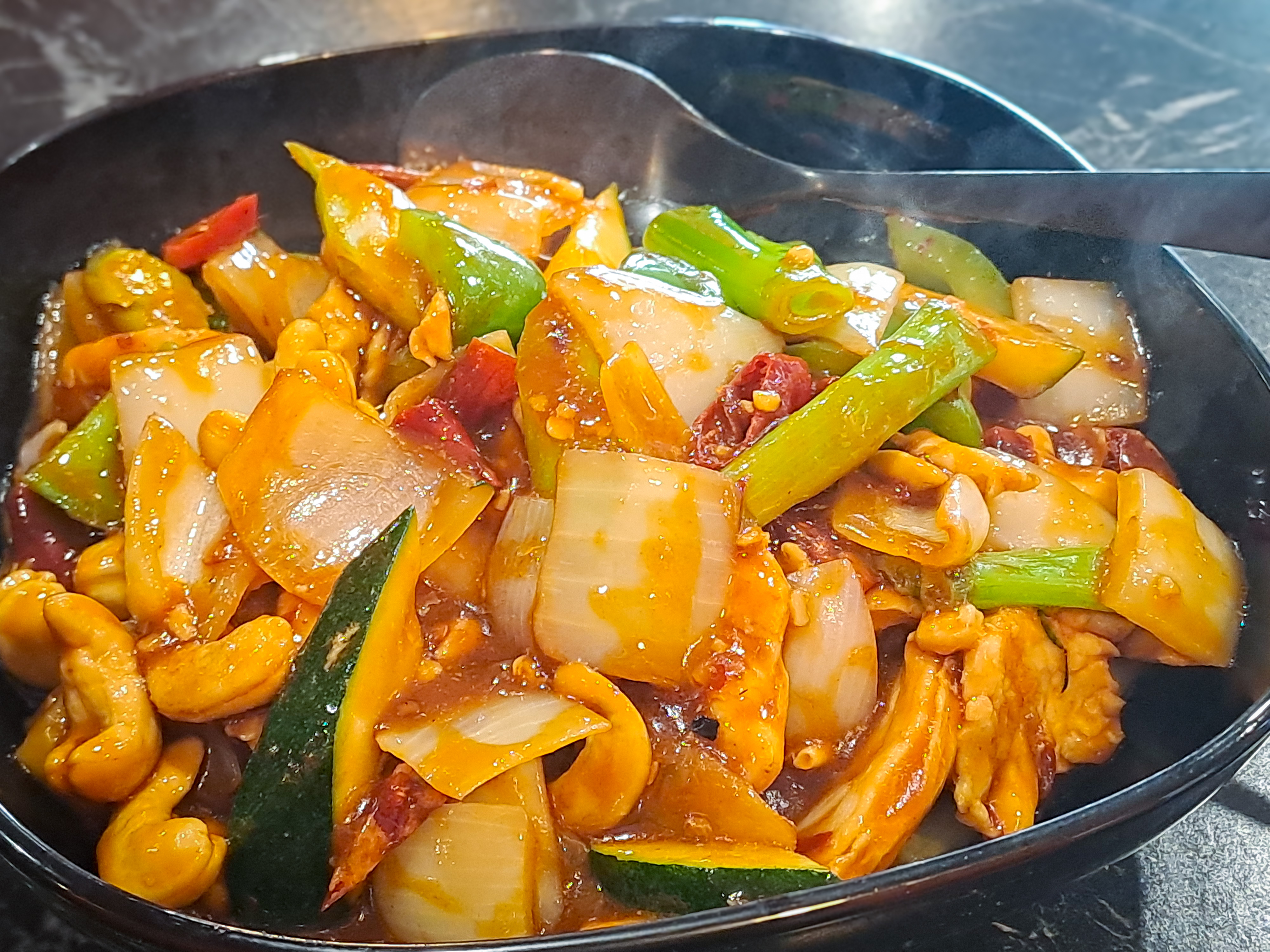 Tender chicken with crunchy cashews and vegetables. GF. Contain: Molluscs, Tree Nuts (Cashew).
