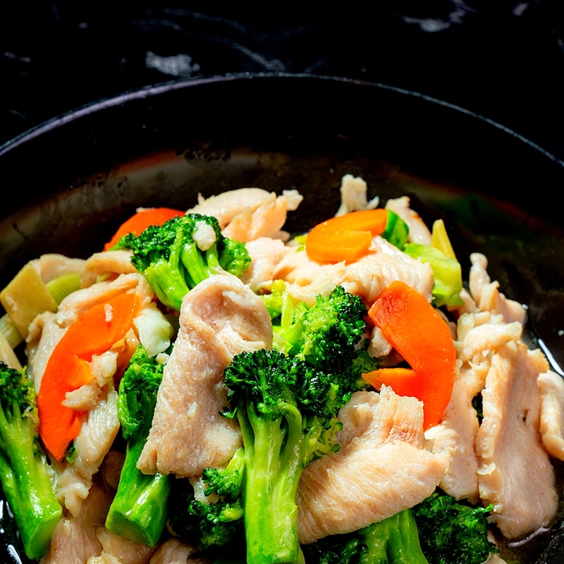 Stir-fried chicken with fresh broccoli in a light sauce. GF. Contain: Molluscs.