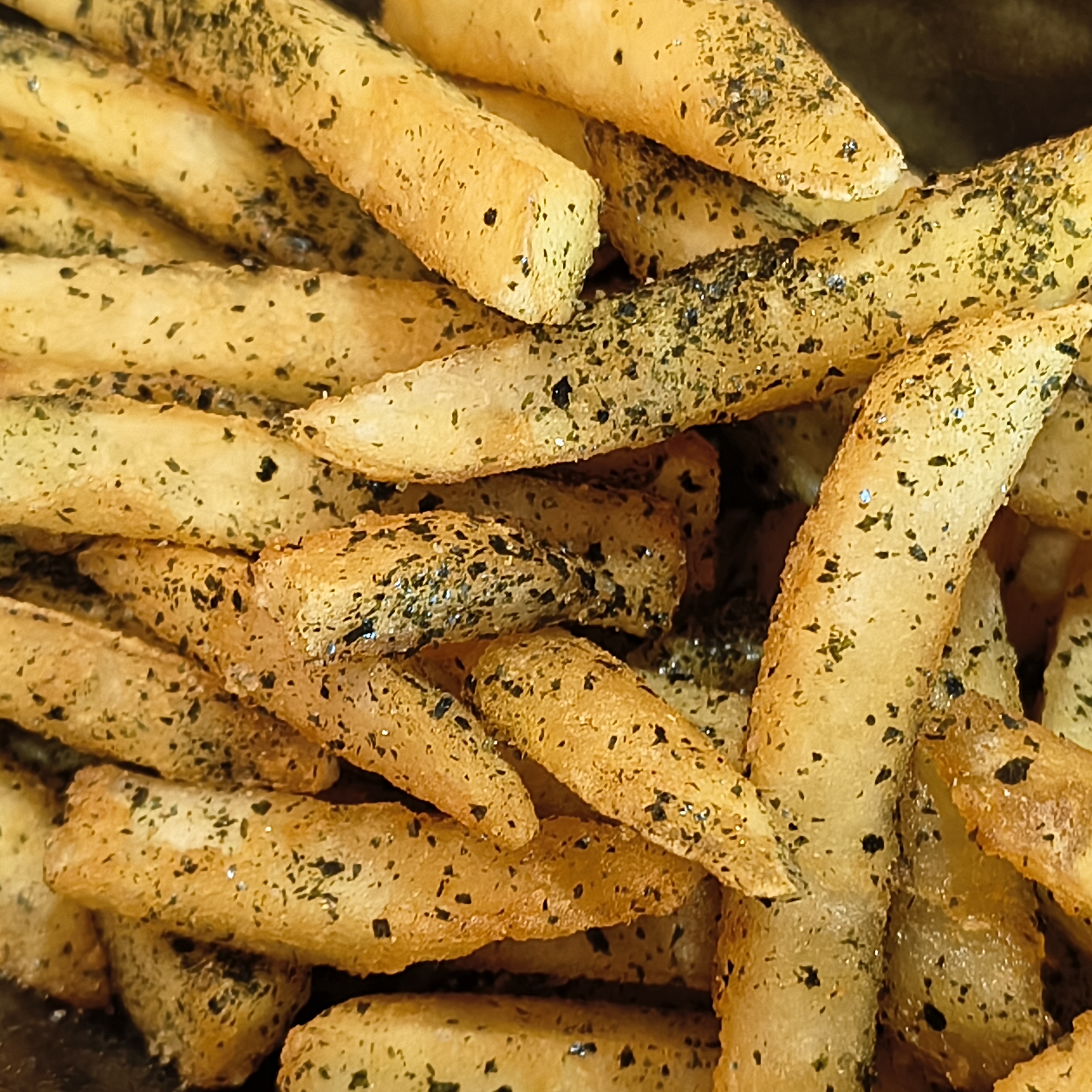 Crispy golden fries dusted with our house-blended seaweed salt, bringing together the umami of seaweed with the bold savoury notes of traditional Chinese flavours. 100% gluten-free and addictively tasty. 250g each serve. GF. Vegan.