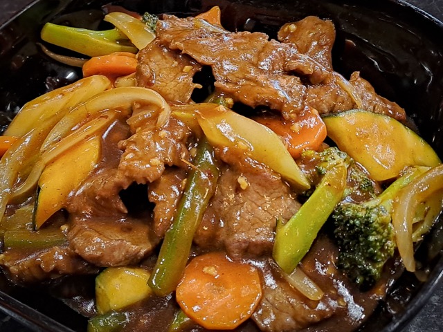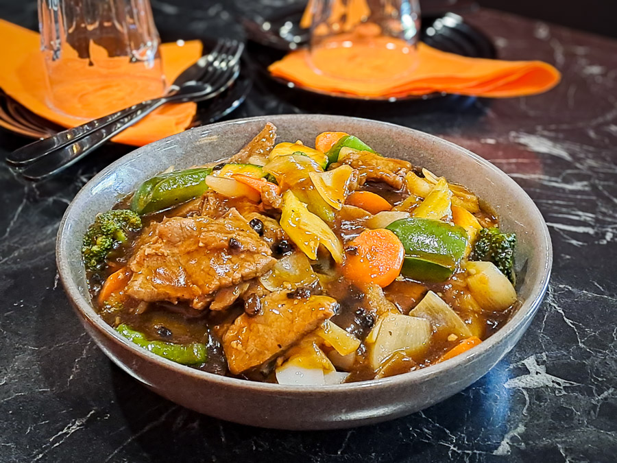 Juicy beef stir-fried with vegetables in a rich, savory black bean sauce. GF. Contain: Soy, Molluscs.