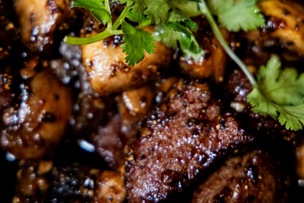 Mild Peppery Flavour. Tender cubes of wagyu striploin stir-fried over high heat with aromatic black pepper sauce and mushroom. Richly marbled and wok-seared for a bold, flavour-packed experience. GF. Contain: Milk, Molluscs, Soy.