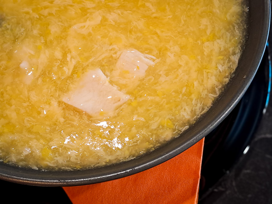 A comforting soup with tender chicken and sweet corn kernels. GF. Contain: Egg.