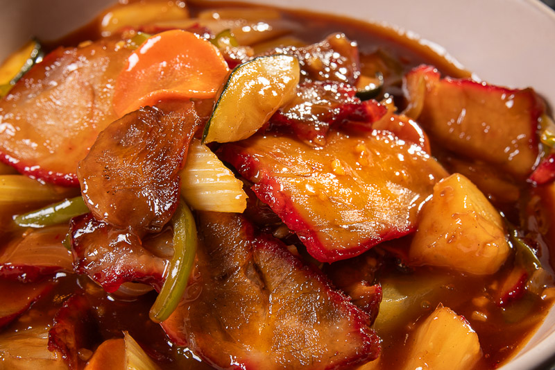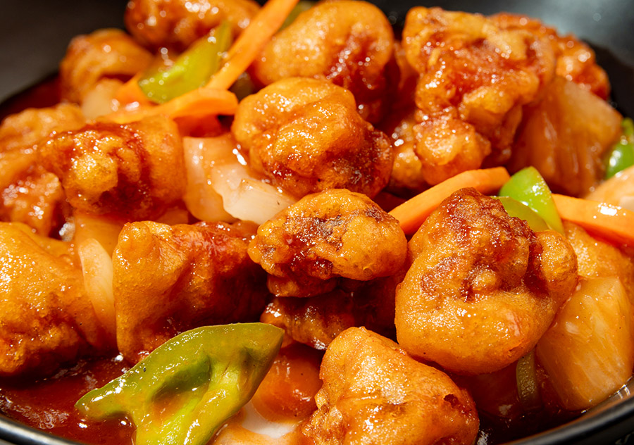 Crispy pork tossed in a tangy sweet and sour sauce with pineapple and bell peppers. GF. Contain: Soy.