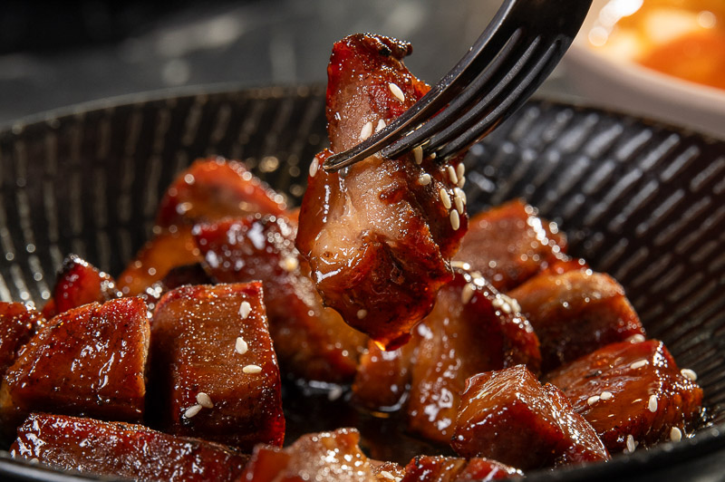 Tender slices of premium pork, marinated in a house blend of spices and finished with a delicate honey glaze. Roasted at high heat for a beautifully caramelised edge and juicy centre — a modern take on a Cantonese classic. 250g. GF. Contain: Egg, Molluscs, Sesame (from garnish).