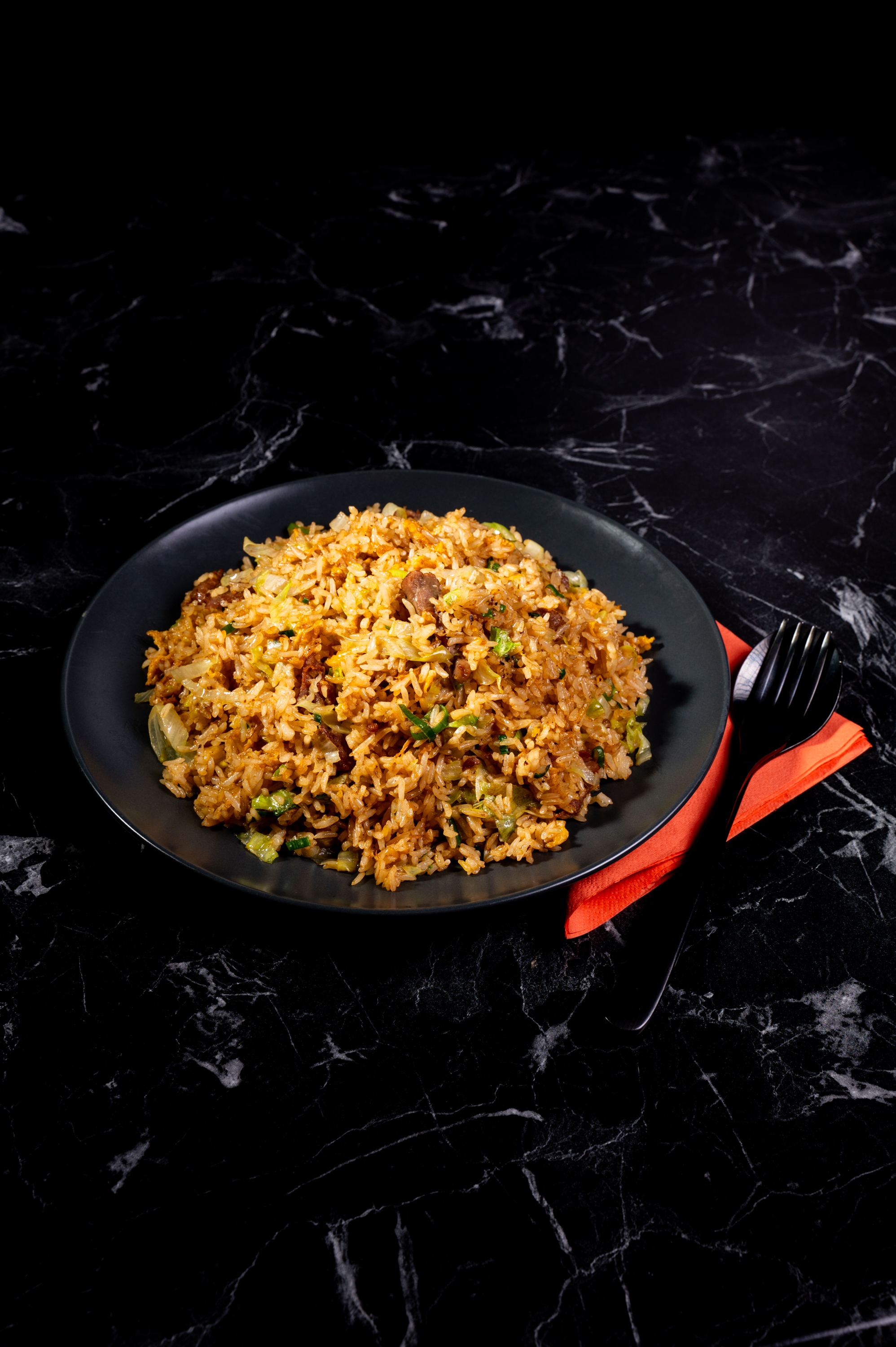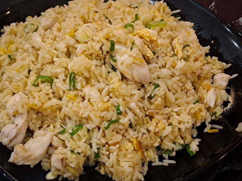 Juicy chicken stir-fried with rice, eggs, and vegetables in a savory blend. GF. Contain: Soy, Egg.