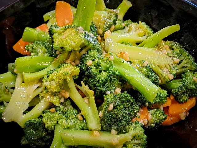 Fresh broccoli stir-fried with aromatic minced garlic for a simple and flavorful dish. GF. Vegetarian. Contains: Soy.