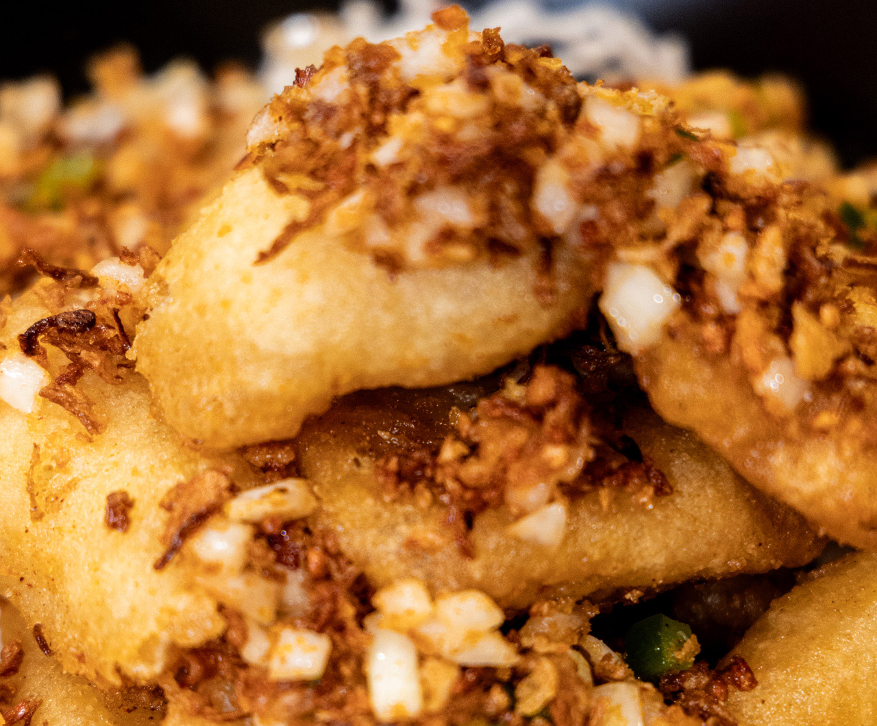 Mild Pepper Spice. Crispy squid with salt and pepper seasoning. GF. Contain: Molluscs.
